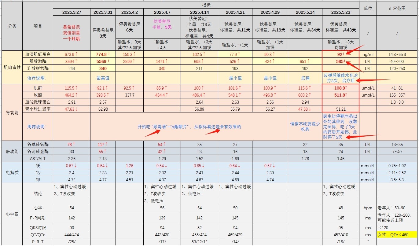 7 H: K4 |4 V1 \$ ~现在问题:肌肉毒性(肌酸激酶、肌红蛋白,双高)、肾功能异常(不知道是佐利替尼的影响还是万古霉素的影响?感觉我妈ommaya囊手术用万古霉素以前,肌酐就从没超过120,现在是经常在130-150之间波动,用两次还原型谷胱甘肽就降到130多,然后又反复回升)7 K# o% i- c% `. D6 C L
